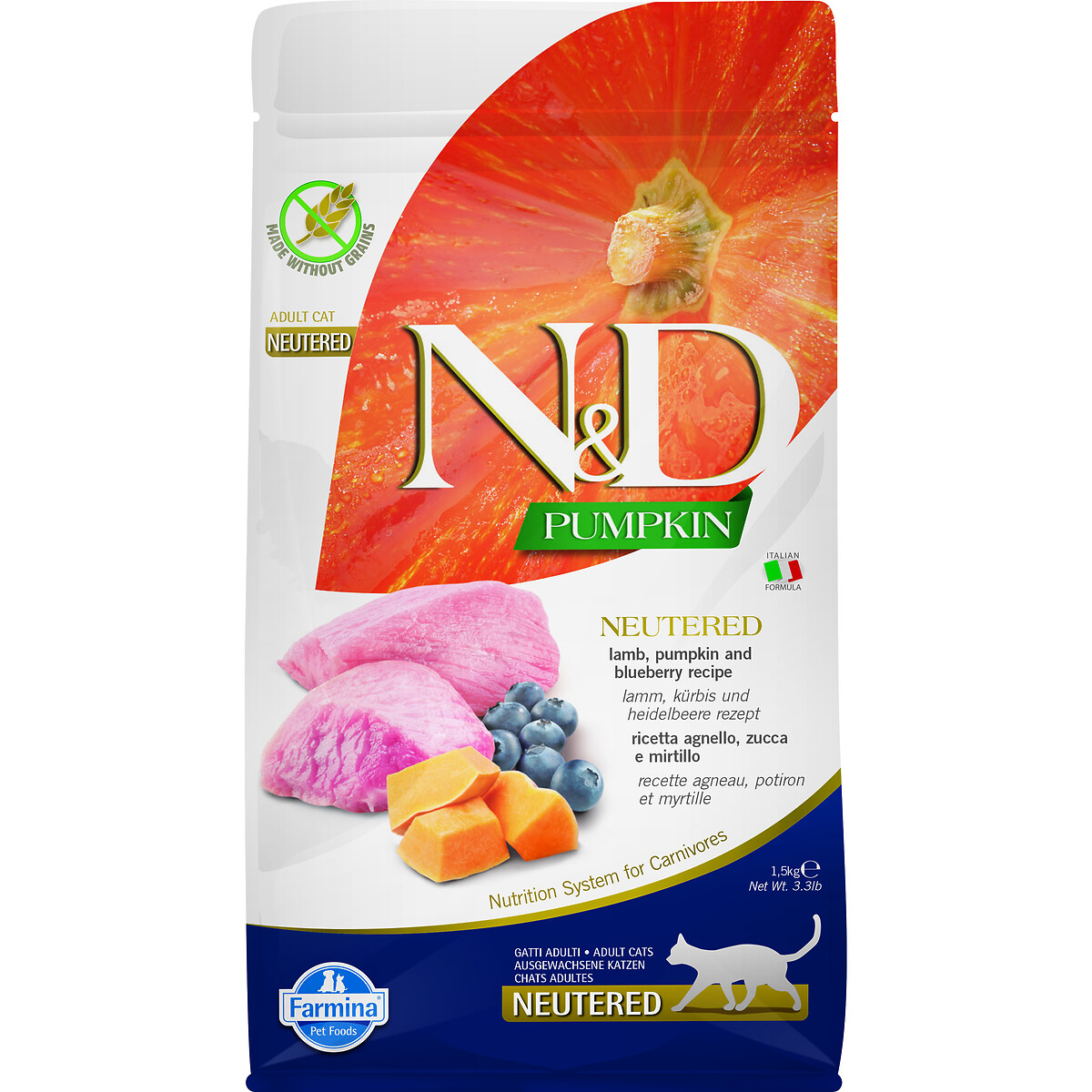 Беззерновой рацион Farmina N&D Neutered с ягненком, тыквой и черникой разработан специально для взрослых стерилизованных кошек с учётом их измененных потребностей в питании. В основе формулы - легкоусвояемое мясо ягненка как источник полноценного животного белка, помогающего поддерживать мышечную массу без избыточной нагрузки на организм.