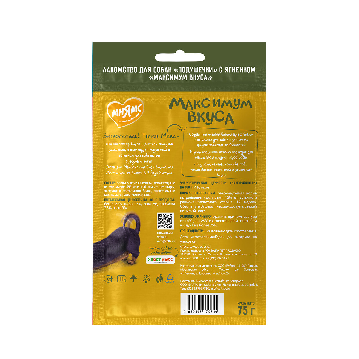 Подушечки с говядиной - это не просто лакомство, а продуманная награда, которая приносит собаке радость и пользу. Главный инспектор вкуса Макс от Мнямс подтверждает: как только появляется упаковка, уровень счастья резко возрастает, а хвост начинает работать в усиленном режиме.